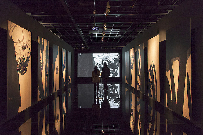 Zhejiang Art Museum, Hangzhou, Zhejiang, China. A multimedia display of Clifford Ross' abstract meditation on a small ink painting executed by Pan Gongkai. Their collaboration at the Zhejiang Art Museum showcases their ongoing work together. This installation which includes a 12' high video and twelve 4x8' maple wood panels, with the panels then hung from the ceiling over a black glass floor.